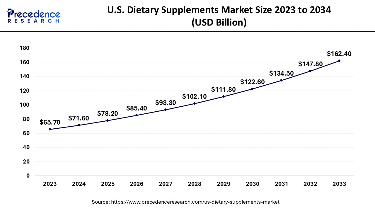 The U.S. dietary supplements market size was valued at USD 78.20 billion in 2025 and is projected to rise from USD 85.40 billion in 2026 to nearly USD 162.40 billion by 2033, growing at a healthy CAGR of 9.47% from 2024 to 2033. The rising geriatric population in the country and the demand for preventive and nutrition supplements are driving the growth of the U.S. dietary supplements market.
