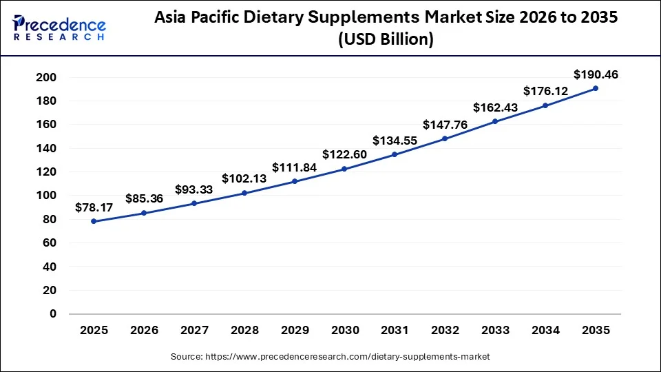 The Asia Pacific dietary supplements market is experiencing robust growth, with its value reaching USD 78.17 billion in 2025 and expected to surge to approximately USD 190.46 billion by 2035. This expansion reflects a strong CAGR of 9.31% between 2026 and 2035, driven by rising health awareness, preventive healthcare adoption, and increasing consumer demand across the region.